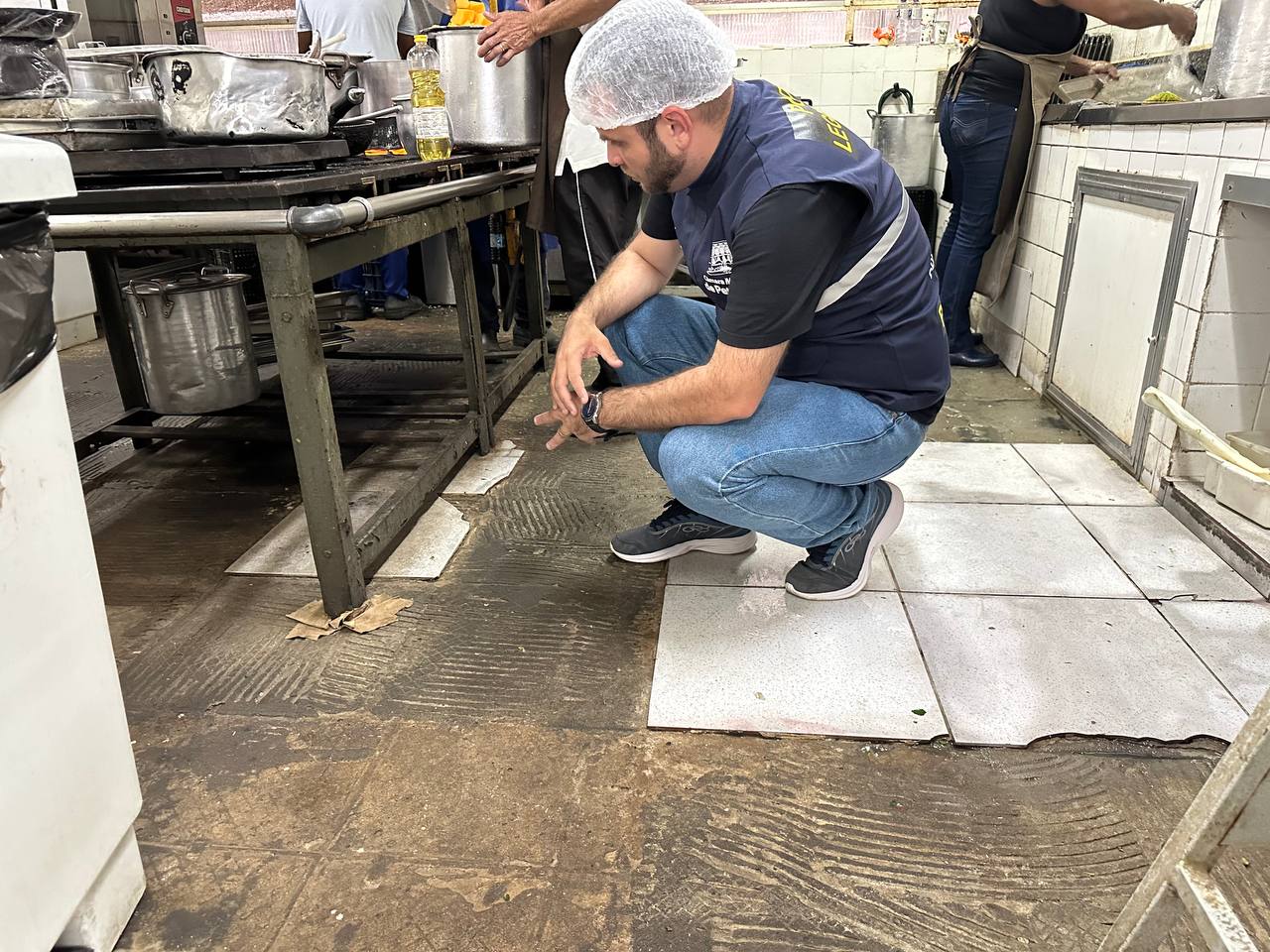 Durante a ação, o Vereador flagrou diversos problemas na unidade, desde o piso danificado e dificuldades no escoamento de água, até a falta de estrutura básica, como a falta de móveis para sustentar as panelas, de modo que os funcionários precisaram utilizar caixotes de feira para servirem de apoio.