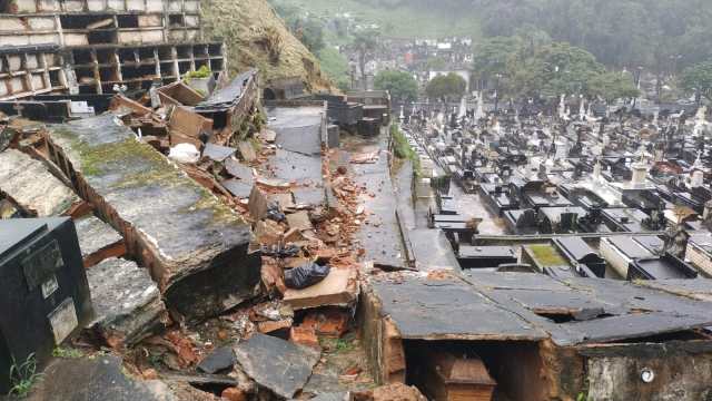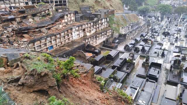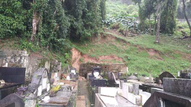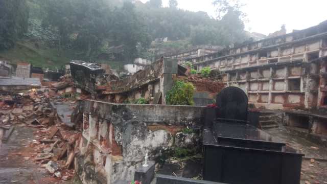 O principal cemitério de Petrópolis, na Rua Fabrício de Matos, no Centro, também sofreu as consequências das chuvas que caem desde a quinta-feira na cidade. Sem estrutura adequada e alvo de críticas constantes devido a falta de conservação, o lugar não resistiu ao temporal.