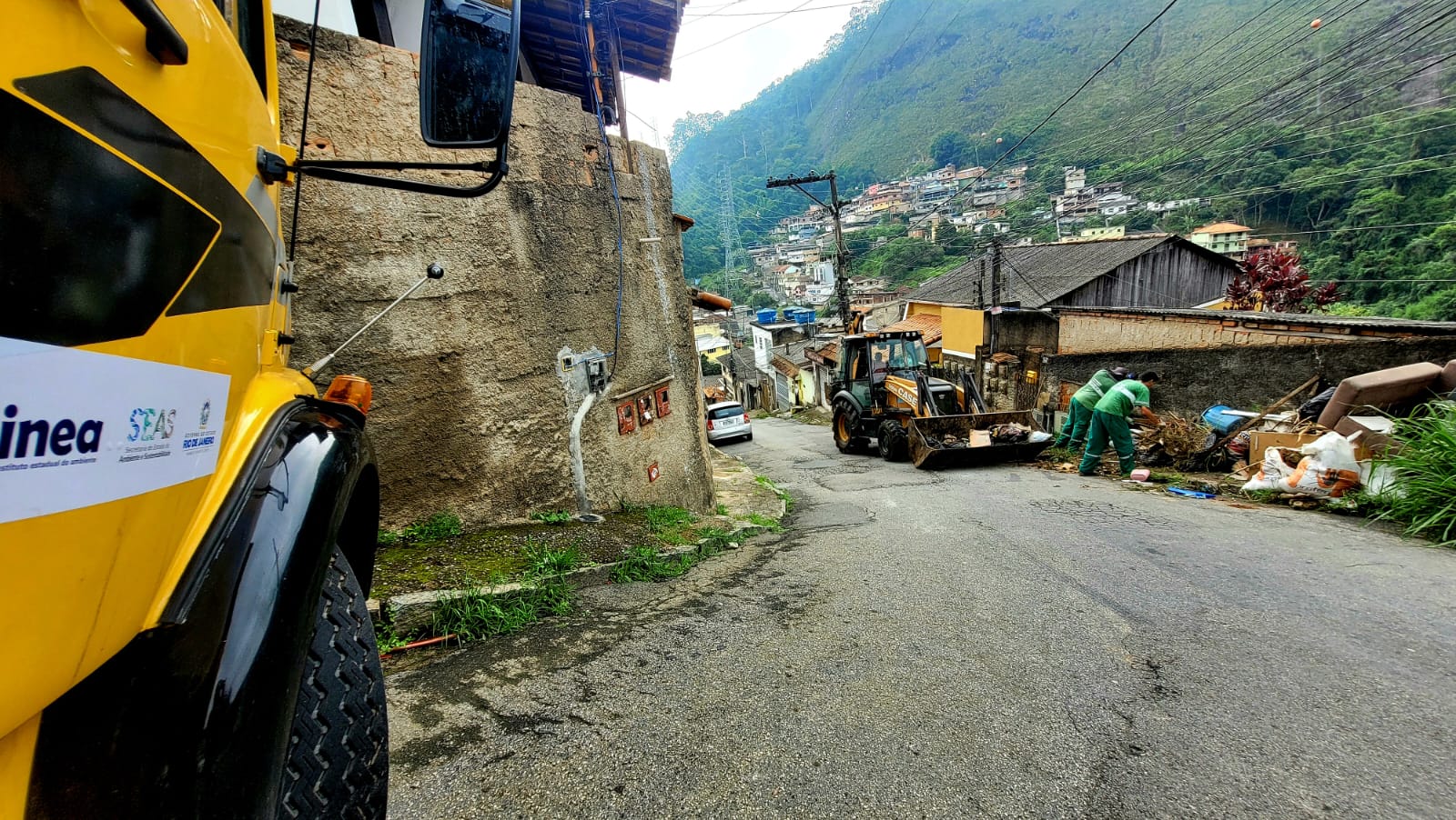 O trabalho da Comdep ganhou um importante reforço na manhã de segunda-feira (06), com a chegada de quatro retroescavadeiras, quatro caminhões toco e quatro caminhões truck do Instituto Estadual do Ambiente – Inea. O maquinário entrou imediatamente em operação, atuando, inclusive no Jardim Salvador, onde o ônibus que atende a comunidade já estava com dificuldades na manobra.